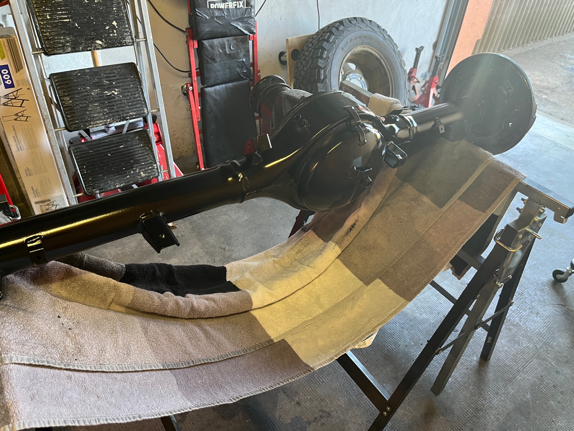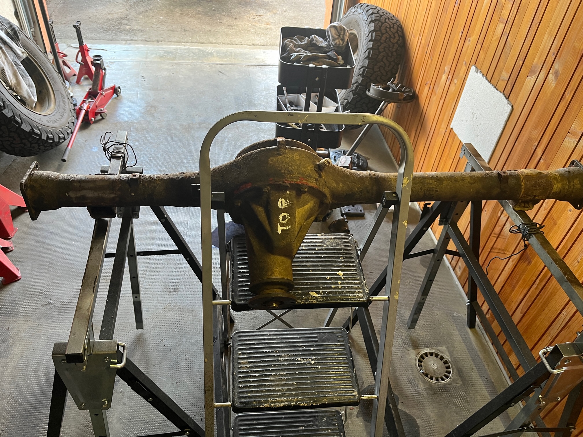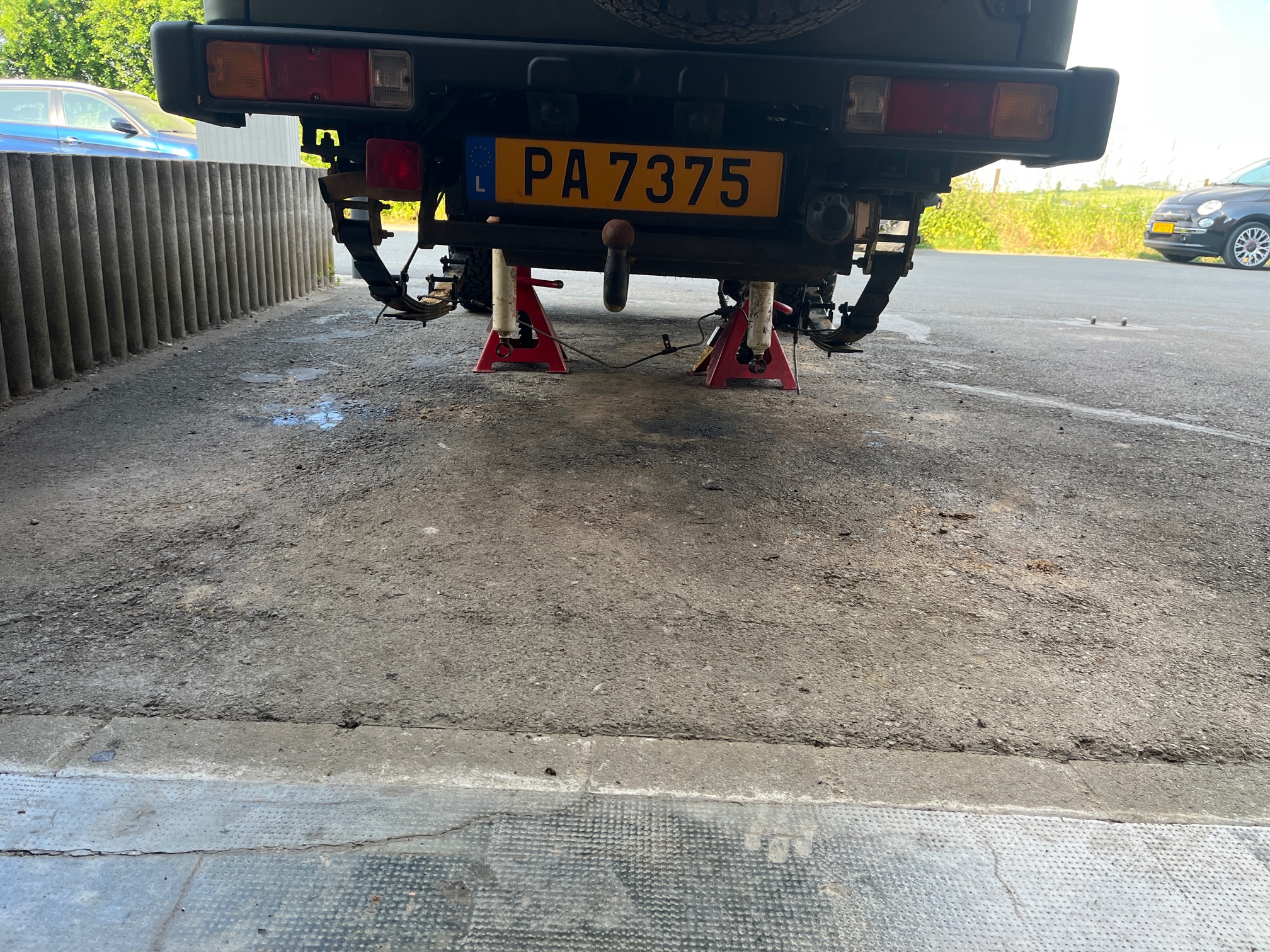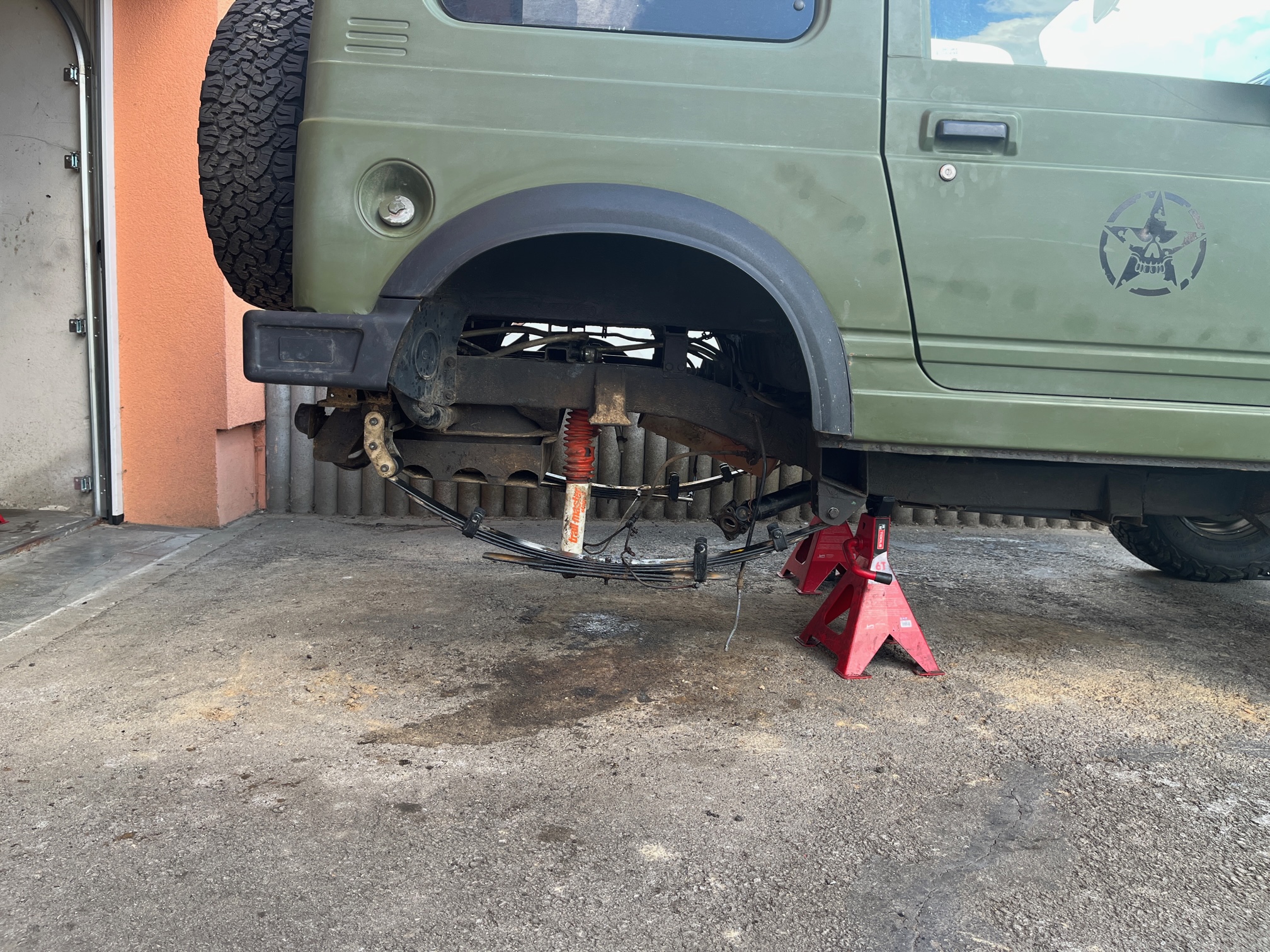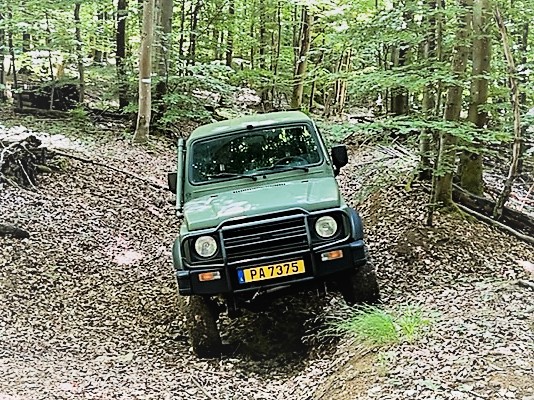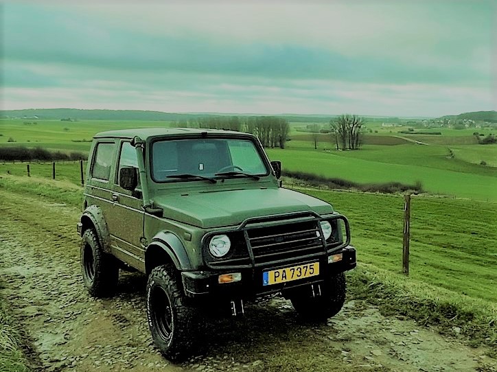 1.3 i with 70 HP, enough for it, 4.16 T case , 2" full lift kit from TrailMaster, 235/75R15 BFG's AT KO2, UCP from MasterForest, winch, Homemade snorkel, Optimal Yello batterie and Honda CRX MK2 seats . Love those Samies